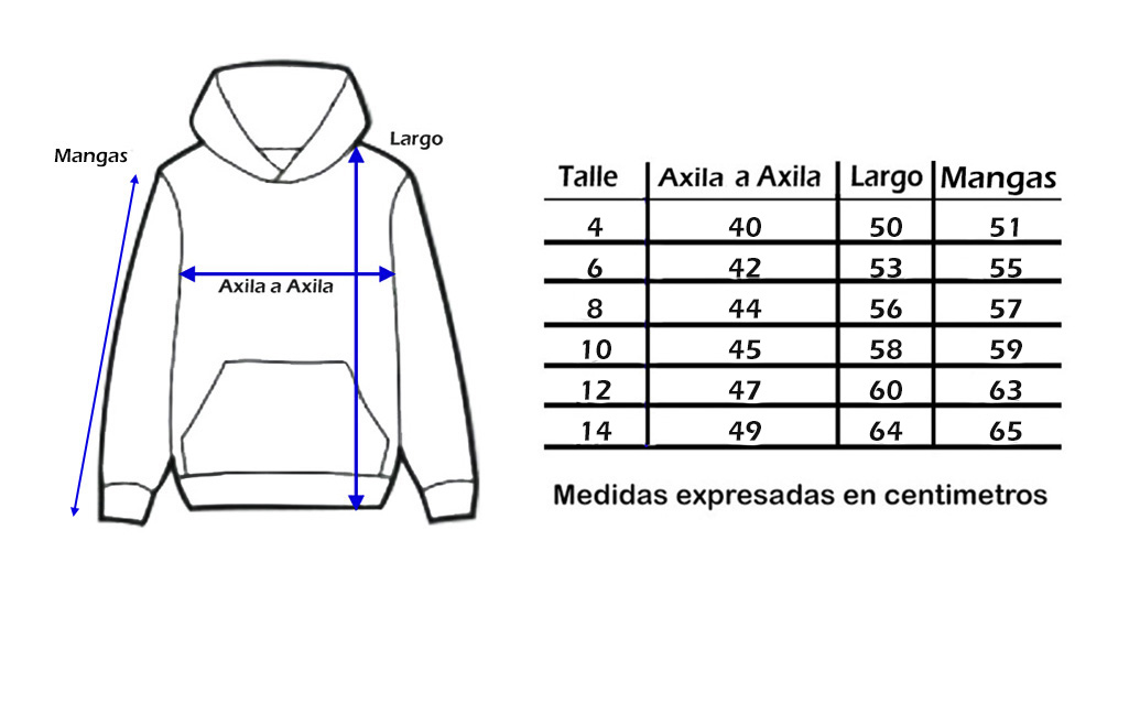 A continuación te dejamos una tabla de medidas de referencia para que puedas comparar con la medida de alguna prenda del pequeño hincha.Tener en cuenta que las medidas son aproximadas y pueden tener un margen de diferencia de +/- 1 cm de la tabla