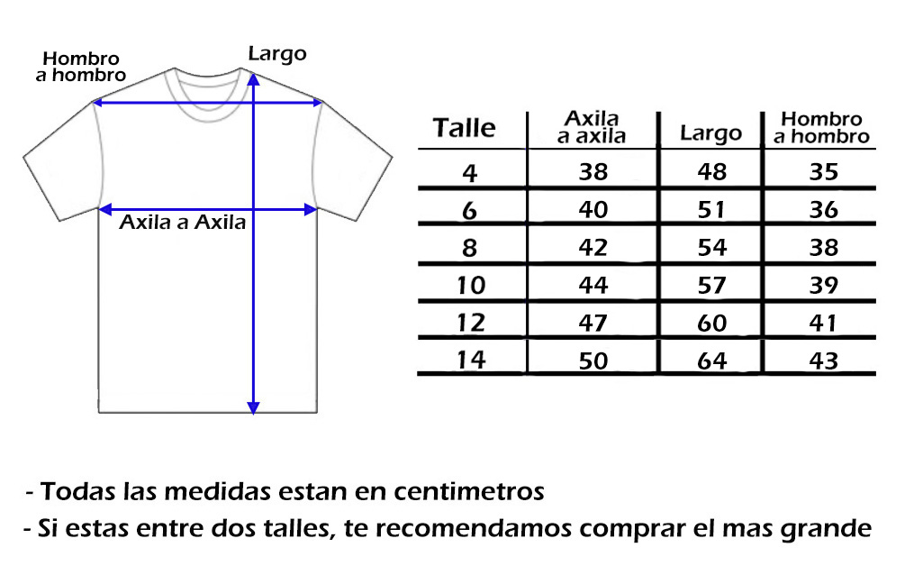 A continuación te dejamos una tabla de medidas de referencia para que puedas comparar con la medida de alguna otra remera. Tene en cuenta que las medidas son aproximadas y pueden tener un margen de diferencia de +/- 1 cm de la tabla