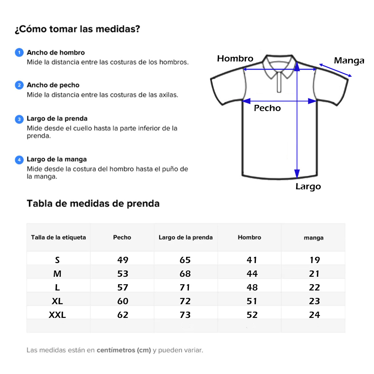 A continuación te dejamos una tabla de talles de referencia para que puedas comparar con la medida de otra remera que vaya bien. Tene en cuenta que las medidas son aproximadas y pueden tener un margen de diferencia de +/- 1 cm de la tabla