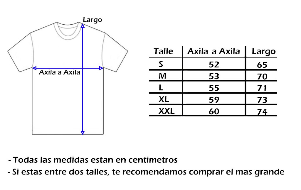 A continuación te dejamos una tabla de medidas de referencia para que puedas comparar con la medida de alguna otra remera que te vaya bien. Las medidas son aproximadas pueden tener un margen de diferencia de +/- 1 cm de la tabla