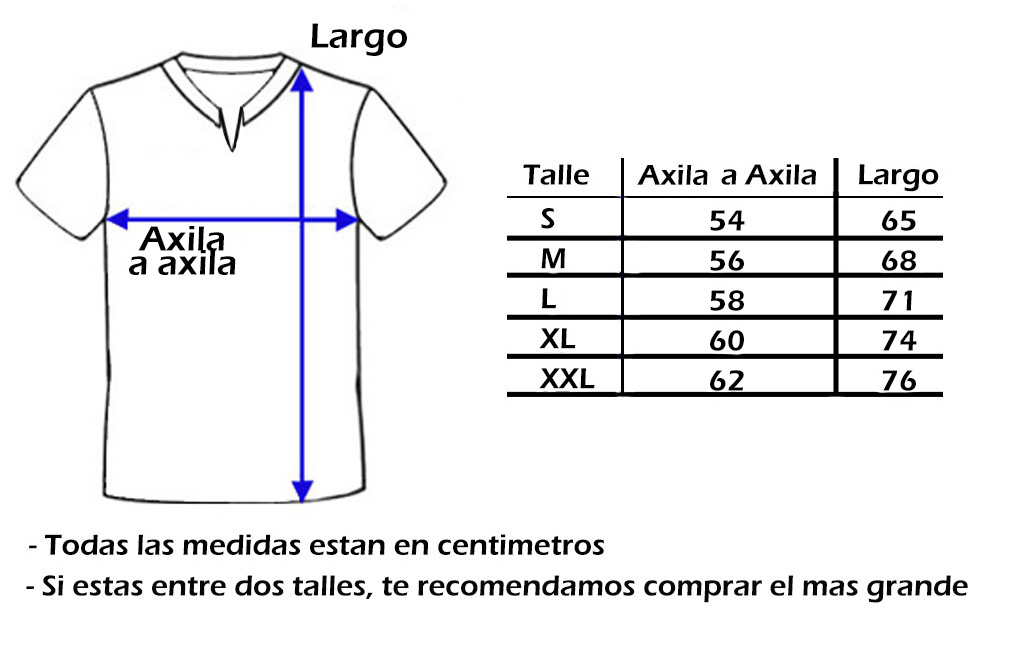 A continuación te dejamos una tabla de medidas de referencia para que puedas comparar con la medida de alguna otra remera. Tene en cuenta que las medidas son aproximadas y pueden tener un margen de diferencia de +/- 1 cm de la tabla